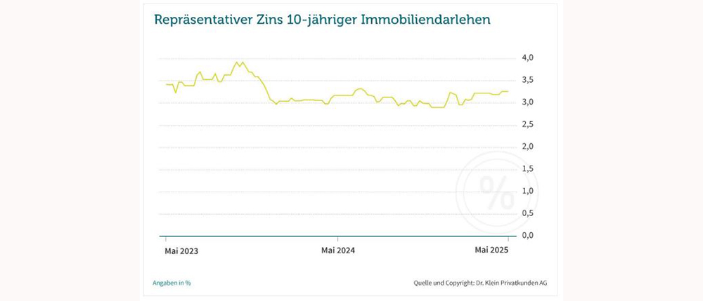 Wie sensibel das Zinsumfeld allerdings auf handelspolitische Vorkommnisse reagiert, zeigte Ende Mai eine erneute Zoll-Eskapade von Donald Trump. Seine Ankündigung, Waren aus der EU ab dem 1. Juni mit Zöllen in Höhe von 50 Prozent zu belegen, sorgte wiederholt für Unruhe an der Börse. Folglich suchten Investoren nach sicheren Anlagen – die Nachfrage nach Anleihen stieg. „Die Baufinanzierungszinsen orientieren sich vor allem an der Rendite der 10-jährigen Bundesanleihe. Sie war nach Trumps Ankündigung zunächst leicht gefallen, nach der anschließend mit der EU ausgehandelten Fristverlängerung bis zum 9. Juli dann wieder etwas gestiegen – die Bauzinsen zogen entsprechend nach“, erklärt Pfaffinger. Aktuell beträgt der repräsentative Zins von Dr. Klein für eine 10-jährige Baufinanzierung 3,26 Prozent (Stand: 03.06.2025).
