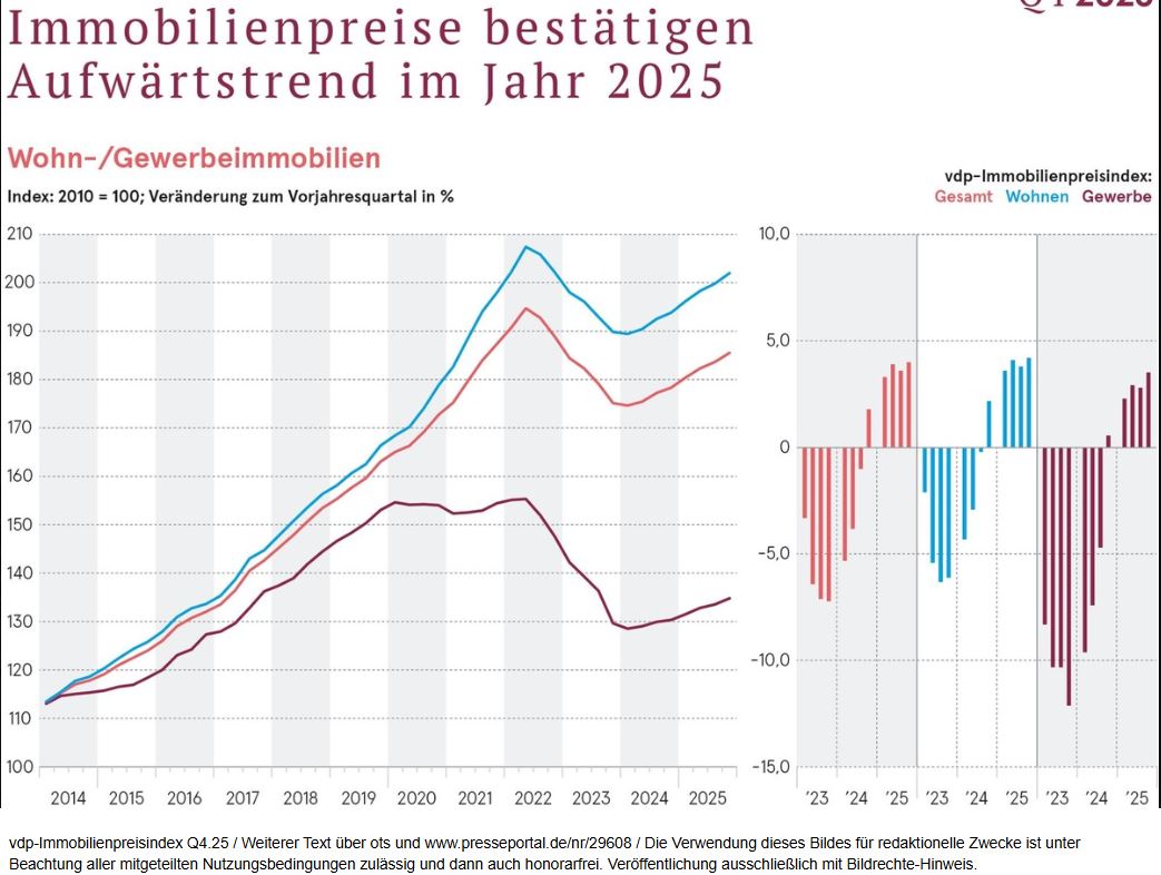 "Nach der abrupten Zinswende hat der Immobilienmarkt in Deutschland seine Erholungsphase im Jahr 2025 fortgesetzt. Die Preise steigen stetig, jedoch deutlich weniger dynamisch als in der Niedrigzinsphase", erläuterte vdp-Hauptgeschäftsführer Jens Tolckmitt. Aufgrund des anhaltenden Wohnraummangels sei davon auszugehen, dass Wohnimmobilien auch im laufenden Jahr Preiszuwächse verbuchen würden. Die Entwicklung der Gewerbeimmobilienpreise sei dagegen schwieriger vorherzusagen. "Wirtschaftliche Entwicklung und Geopolitik bleiben relevante Unsicherheitsfaktoren", so Tolckmitt.