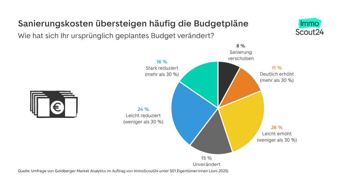 Deutsche Eigentümer:innen sanieren ihre Immobilien überwiegend mit kleinen Budgets und aus eigener Tasche. Wirtschaftliche Unsicherheit und Handwerkermangel bremsen größere Investitionen. Auch wünschen sich viele eine bessere Übersicht der Förderungsmöglichkeiten. Das zeigen die Ergebnisse einer repräsentativen Umfrage im Auftrag von ImmoScout24.