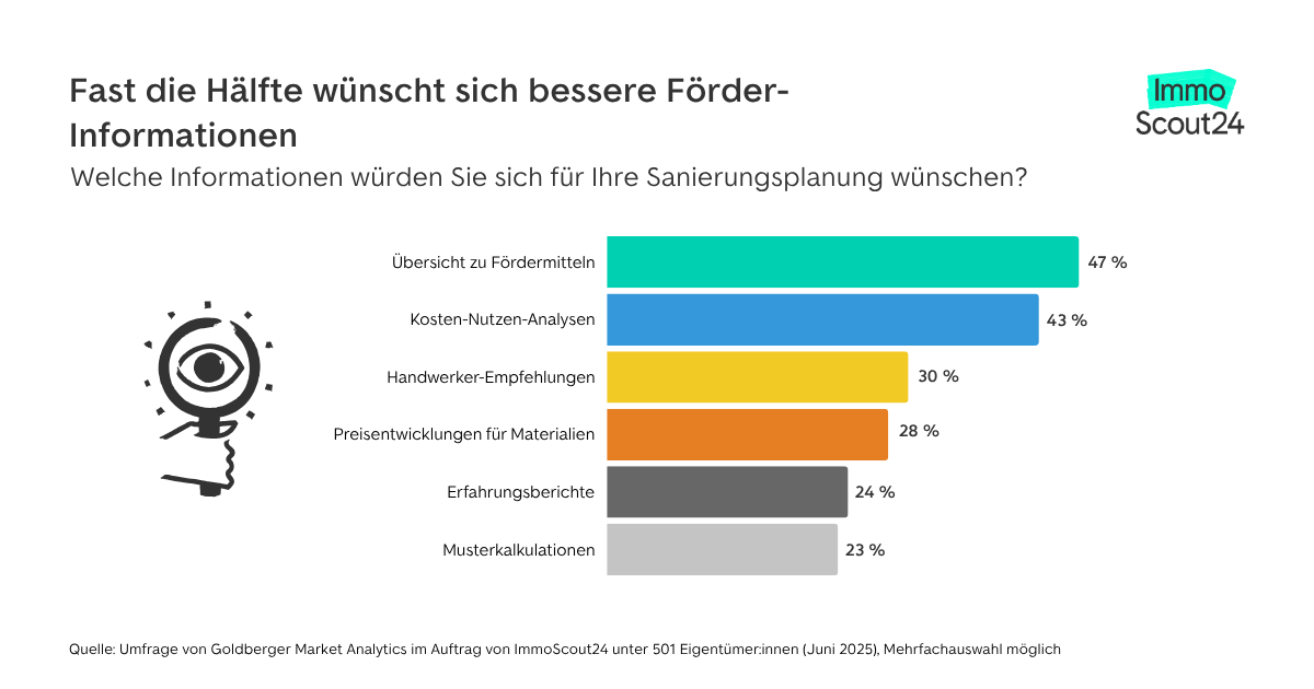 Ergebnisse einer repräsentativen Online-Umfrage von Goldberger Market Analytics im Auftrag von ImmoScout24 im Juni 2025. Befragt wurden deutschlandweit insgesamt 501 Personen im Alter zwischen 18 und 69 Jahren, die eine Immobilie besitzen.