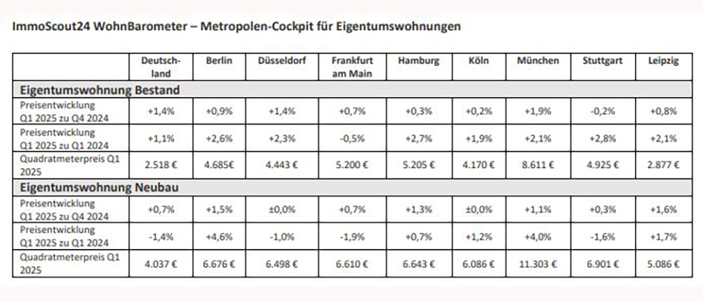 Das ImmoScout24 WohnBarometer für das erste Quartal 2025 zeigt eine klare Tendenz nach oben: Für Bestands- und Neubauwohnungen entwickeln sich die Angebotspreise im Quartalsvergleich in allen acht Metropolen konstant bis steigend. Im Jahresvergleich gibt es bei Neubauwohnungen nur noch in drei der acht Metropolen Preisabschläge von weniger als zwei Prozent. Gestützt wird diese überwiegend positive Preisentwicklung durch einen starken Nachfrageanstieg im Februar und März.