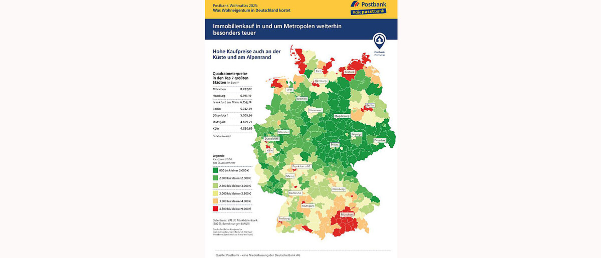 Der Abwärtstrend bei den Immobilienpreisen in Deutschland hat sich im Jahr 2024 fortgesetzt, aber deutlich abgeschwächt: Im Durchschnitt aller Landkreise und kreisfreien Städte sanken die Kosten für Eigentumswohnungen im Bestand gegenüber dem Vorjahr real, also unter Berücksichtigung der Inflationsrate von 2,2 Prozent, um 2,8 Prozent. Im Jahr 2023 lagen die Preise real noch 10,1 Prozent unter dem Vorjahresniveau. Dies sind zentrale Ergebnisse der Studie „Postbank Wohnatlas 2025“. Die Untersuchung führten Expert*innen des Hamburger Weltwirtschaftsinstituts (HWWI) im Auftrag der Postbank durch. Ihre Berechnungen zeigen, in welchen Regionen die Preise besonders stark gefallen bzw. gestiegen sind und wie hoch der durchschnittliche Quadratmeterpreis im Jahr 2024 war.