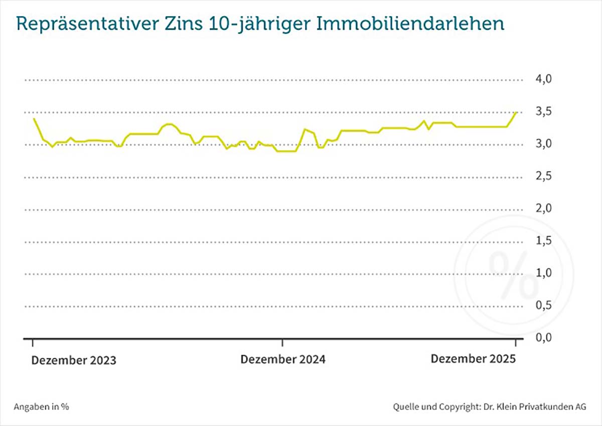 In den vergangenen zwei Wochen orientierten sich die Baufinanzierungszinsen aufwärts – ein kleiner Endspurt in einem Jahr mit weitgehend stabiler Seitwärtsbewegung.  Damit laufen die Zinsen 2025 am oberen Ende des von Dr. Klein prognostizierten Korridors von drei bis 3,5 Prozent aus. Gründe für die übers Jahr betrachtet große Konstanz sieht Florian Pfaffinger in einem Zinsumfeld, in dem es keine großen Überraschungen gab: „Im Herbst waren die Wirtschaftsdaten recht stabil. Die Inflation pendelte sich um die von der EZB angestrebte Zwei-Prozent-Marke ein, und die Konjunkturentwicklung im Euroraum verlief erwartungsgemäß. Somit verabschiedet sich der Herbst mit Blick auf mögliche Zinstreiber recht ereignislos – ein Umstand, der den Zinsen Stabilität verleiht.“ Der aktuelle repräsentative Zins von Dr. Klein für eine 10-jährige Baufinanzierung beträgt 3,5 Prozent (Stand: 16.12.2025).