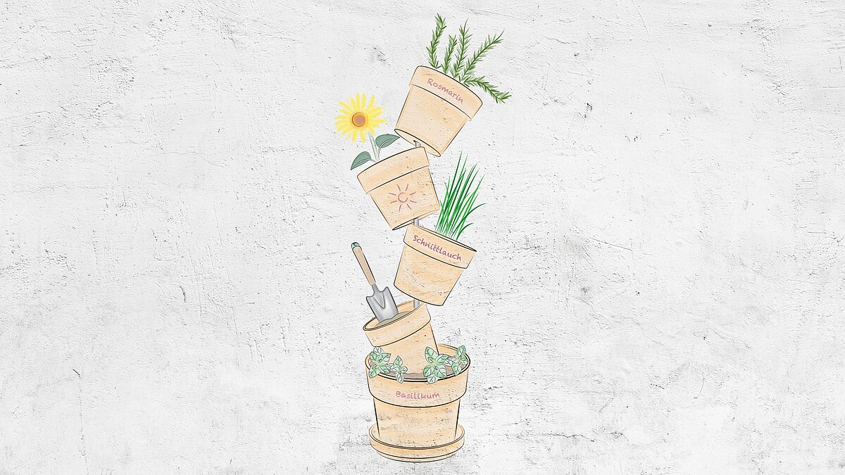 Kräuter, die viel Wasser benötigen, wie Basilikum und Schnittlauch eher in den unteren Topf setzen. Salbei, Rosmarin und Thymian kommen mit weniger Wasser zurecht und fühlen sich in den oberen Töpfen wohl.