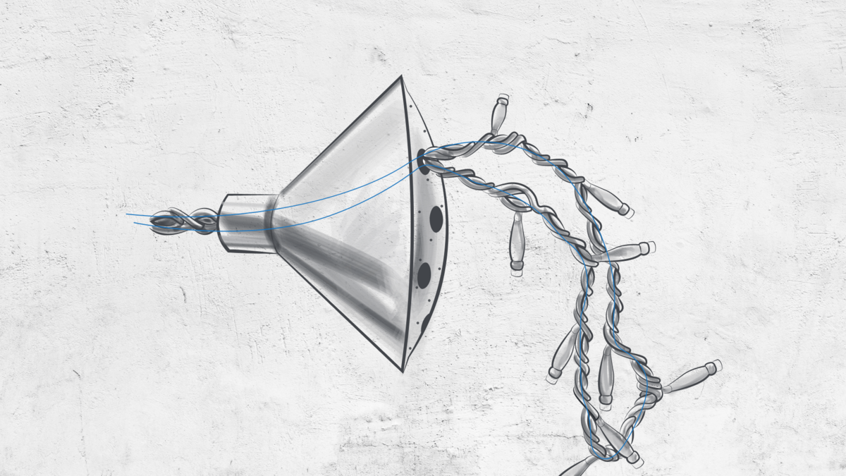 Die Lichterkette durch eines der Löcher führen, eine Schlaufe bilden und wieder durch dasselbe Loch in die Kanne zurückführen. Diesen Schritt für jedes Loch wiederholen.