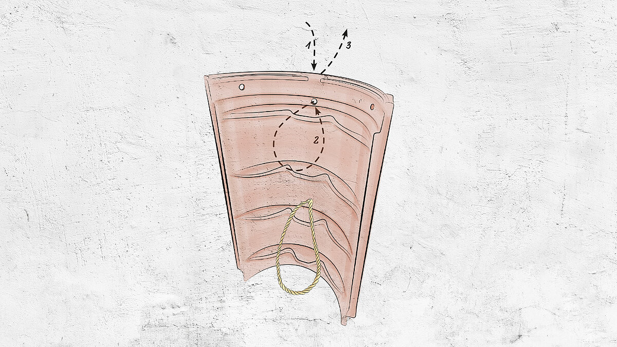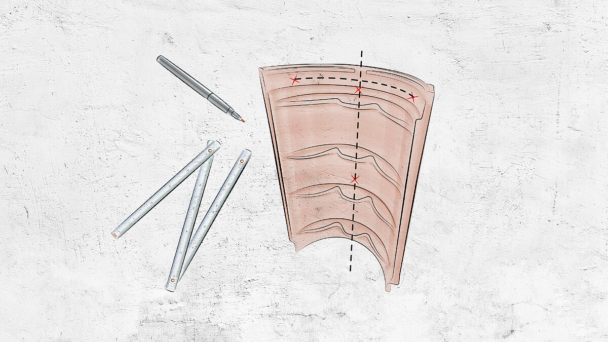 Die vertikale Mitte des Firstziegels ausmessen. Von dort aus am oberen Ziegelrand mit selbem Abstand links und rechts zwei Markierungen für die Löcher zur Aufhängung machen. Unterhalb dieser Markierungen auf der senkrechten Mittellinie zwei Markierungen mit ausreichend Abstand zur Anbringung der Blumentöpfe machen.